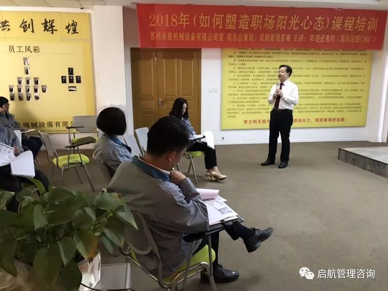 2018年04月09日,【启航管理咨询】高级讲师邓继进先生受邀走进【苏州永良机械】,为学员们开展了《如何塑造职场阳光心态》培训. 本课程旨在帮助学员“找到职场角色认知”和“工作价值”,突破原有心智模式,树立阳光心态,控制情绪压力,学会自我激励,塑造积极进取的职业态度,提高工作效率。