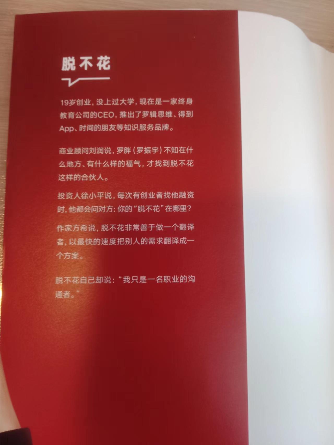 作者脱不化可以说是一个传奇人物。 只有高中学历,没有大学学历的他,似乎不想错过最好的发展机会,主动放弃了接受高等教育的机会。 在创业的过程中,因为接触到业内名人,通过自学、虚心求教、积极交流,在咨询行业发展得很好,最后辞职创业,到了“得到”的时候就成了罗振宇的搭档。 成功的经验不可复制,但这种敢于冒险、敢于放弃的勇气和精神值得学习。