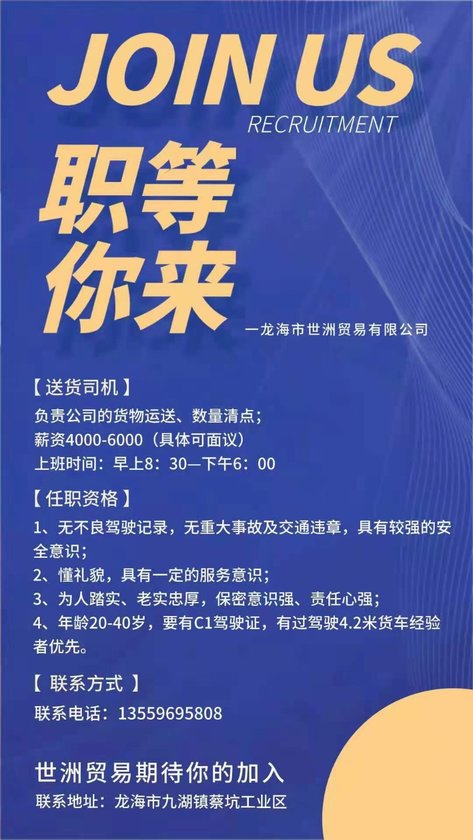 4、司机招聘。 蛇口招聘潮汕线A2司机。 需三证,熟悉潮汕线路及码头操作,能吃苦耐劳,服从安排,订单充足18555444470