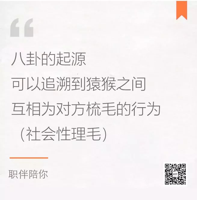 每次八卦,就像我们的祖先互相梳毛捉虱子一样,大脑的奖赏中枢会被激活,我们会得到愉悦的感觉,从而释放工作或生活的压力。