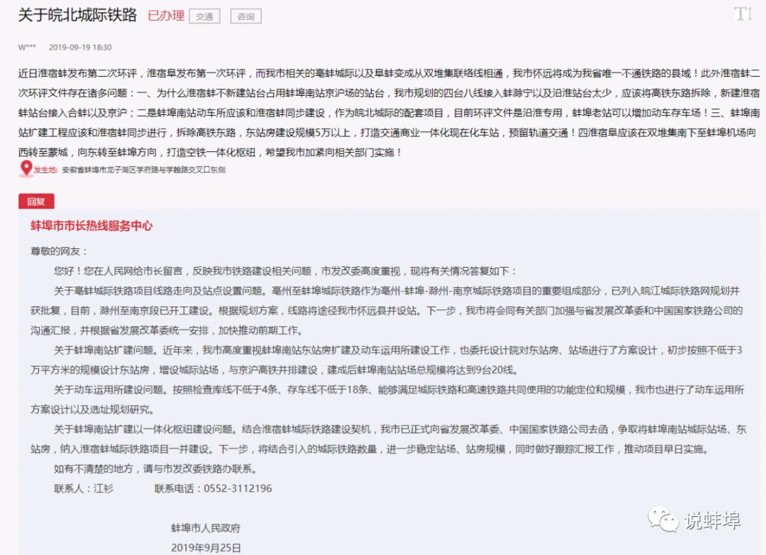 市政府还对网友怀苏奔、博奔城际、高铁站,以及高铁东站扩建问题作出如下答复