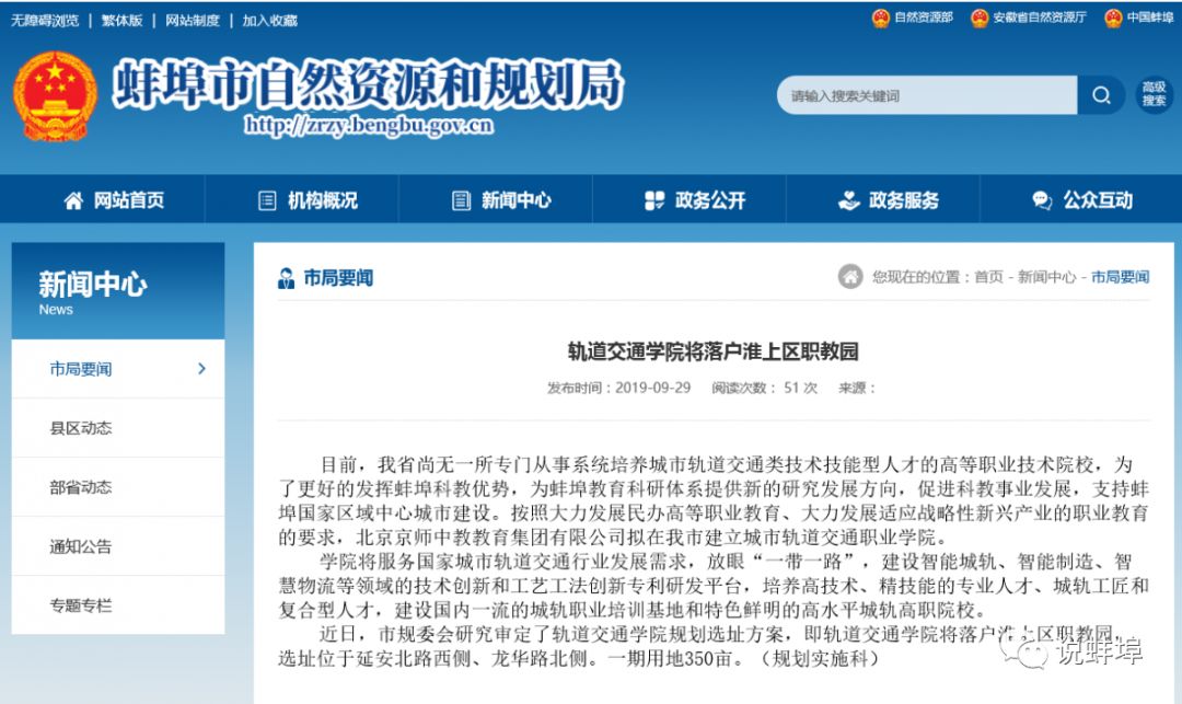 2018年5月25日,在合肥召开的国际皖商大会上,京师教育集团副董事长陆阳与蚌埠市教育局局长乌兰其其格在蚌埠市主要领导的见证下签署京师协议市委市政府教育集团与蚌埠市政府投资协议共建蚌埠城市轨道交通学院。