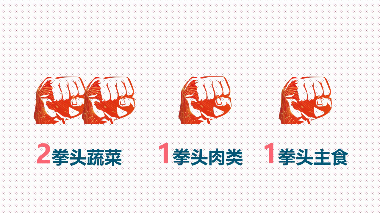 即2个拳头大小的蔬菜,1个拳头大小的肉,1个拳头大小的主食。 同时,进餐顺序是蔬菜、肉类,最后才是主食。