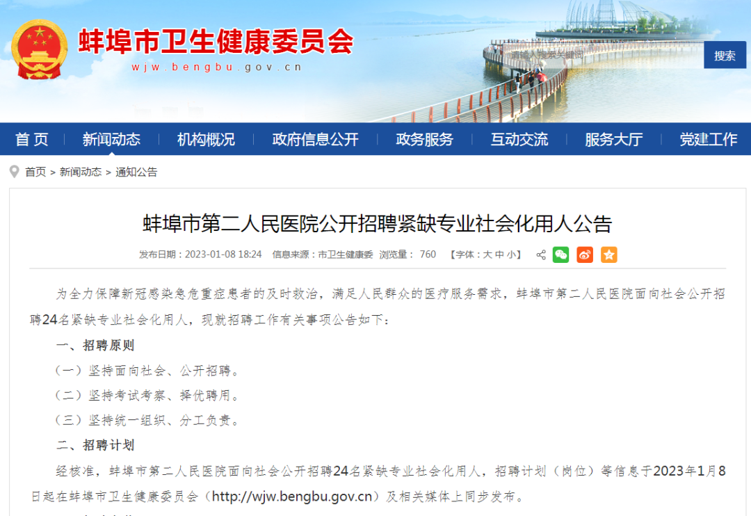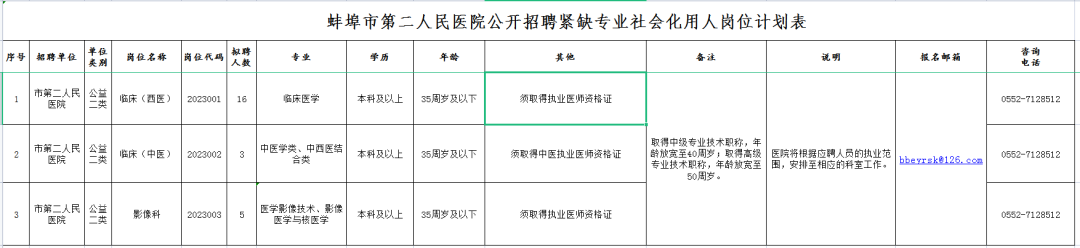 1月8日,无锡市第二人民诊所发布紧急招聘公告蚌埠招聘医院管理人员,面向社会公开紧急招聘24名紧缺专业社会用人单位。 紧急就业计划(岗位)等信息将在扬州市卫健委官网及相关媒体同步发布。