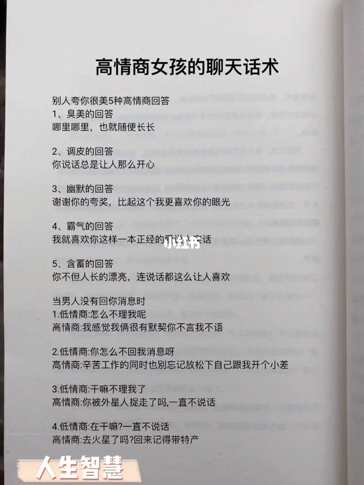 当今社会,最得人心的永远是能说会道的人,嘴巴笨的女人总是会闷闷不乐不是吗? 那么明天,我就教大家三个高智商的人都在偷偷练习的聊天套路。 和别人聊天的时候,只要多用这三个口诀,就可以置身于人群之中,一帆风顺。 一是多疑少表态。 例如,你是怎么减掉这么多体重的? 你是怎么做到的? 又比如,你真漂亮,可以换成你怎么这么漂亮。 可以分享一下你的穿搭经验吗? 嘿,你有没有发现,疑问句不仅能得到人的称赞,还能让你的话更真诚呢? 第二,学会讽刺。 别人夸奖你的时候,你是不是总是害羞不知如何回应? 别人夸你,你明天穿得很漂亮。 你立刻摆摆手说不要,或者尴尬地站在那里,不知如何是好。 这样,除了让你很害羞职场聊天技巧,不自大,以后别人也不会再夸你了。 高智商的人如何应对? 很简单,就是让形意,先顺着对方的话,再反夸回去。 比如有人夸你漂亮,你就说谢谢,我就喜欢你这种有眼光的人。 这么一说,就成了大度人了吧? 三是多认识少剖析。 比如有人跟你说我最近还在加班,天这么冷职场聊天技巧,你跟他说这很正常,我们都是这样工作的,虽然是真的,但说出来就很不人道了。 不过还是说好吧,你最近熬夜了,真的很辛苦,所以我很理解你为什么这么烦人。 你看,换一种表达方式是不是听起来更舒服? 需要多多认清对方的情绪来分析事实,因为人的情绪永远无法被冷冰冰的事实所消化,而倾听对方的情绪是有效沟通的前提。 所以,在这个社会,90%的女人都不擅长说话,所以你只要随意学习一些聊天技巧,在恋爱中就可以轻松打败其他女人。 大家,你同意吗?