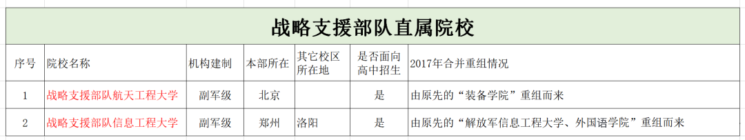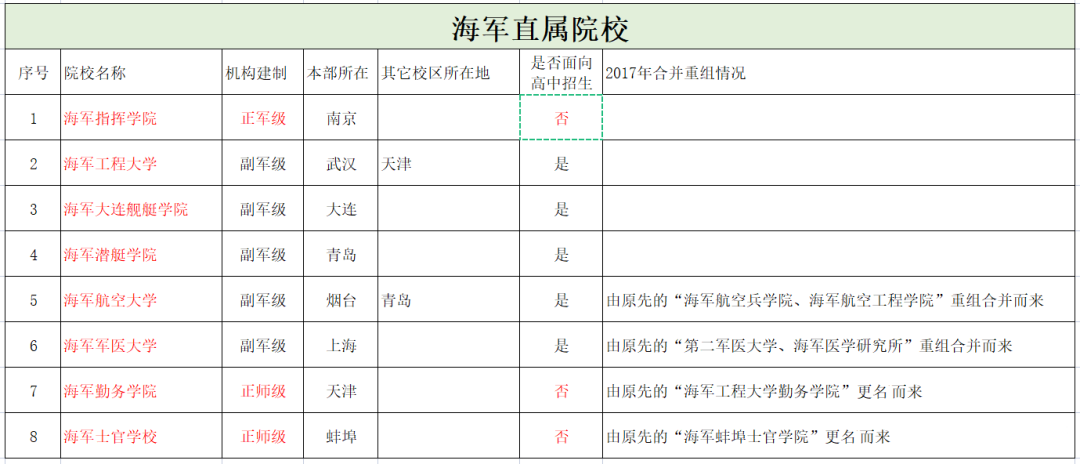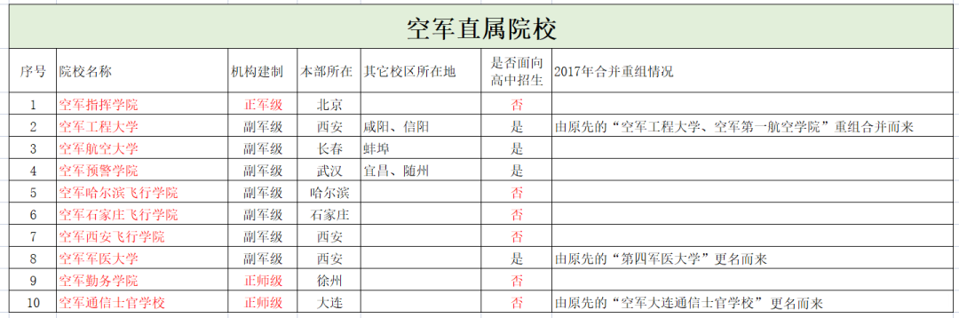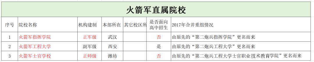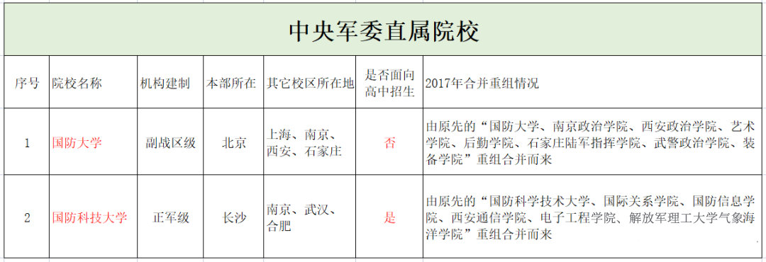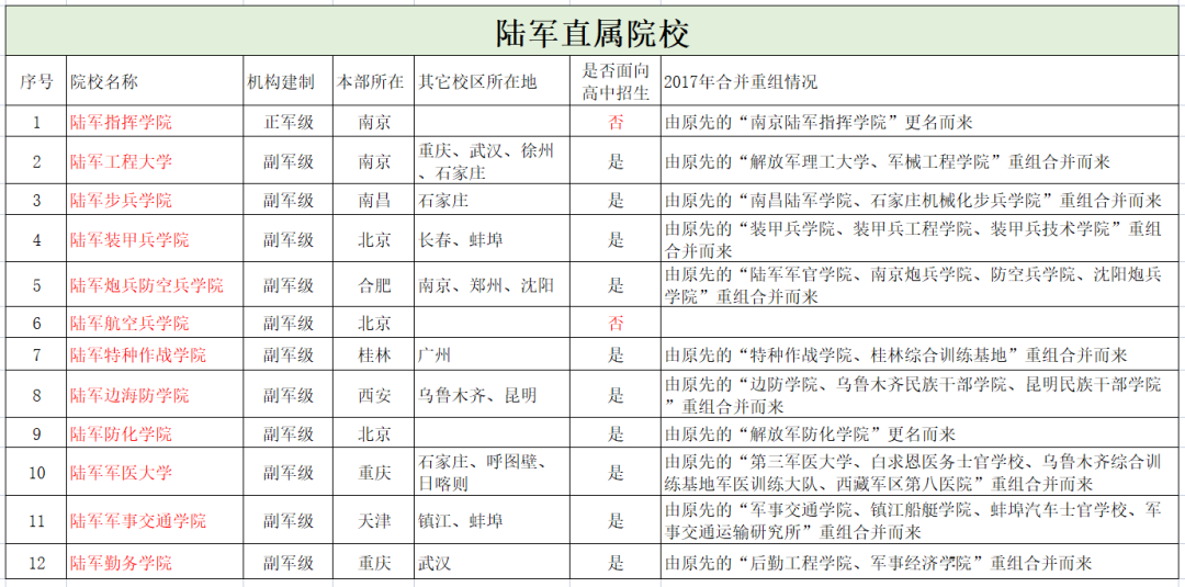 其中面向小学招生27家,不面向社会招生17家。 前者具体包括:国防学院、5所兵种指挥大学、陆军民航大学、3所空军大学、3所职(后勤)大学(不含海军)、4所军官分校。