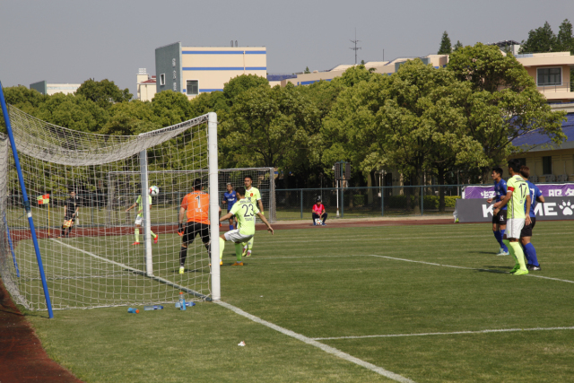 开场14分钟,福州灵山禁区外率先踢出世界波夺冠。