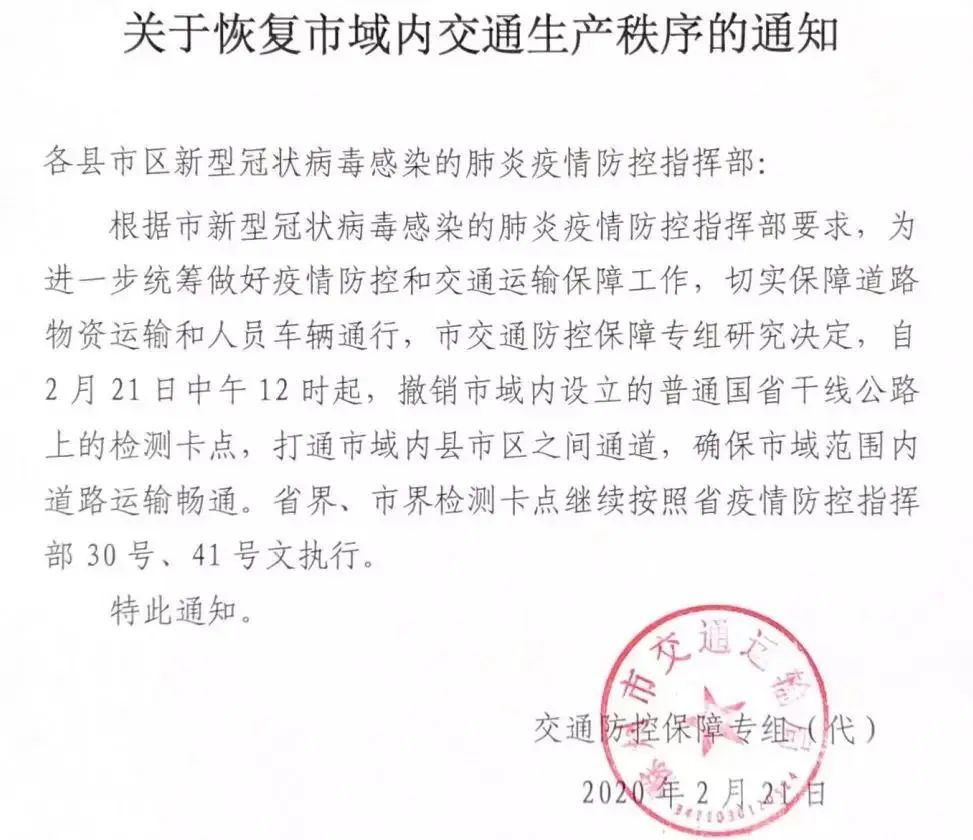 1.取消区内国省干线公路和县乡村道交通管制措施,确保交通运输和城乡公共交通正常运行。 恢复城乡公交运营,严格执行车辆通风消毒制度,驾乘人员必须佩戴口罩。