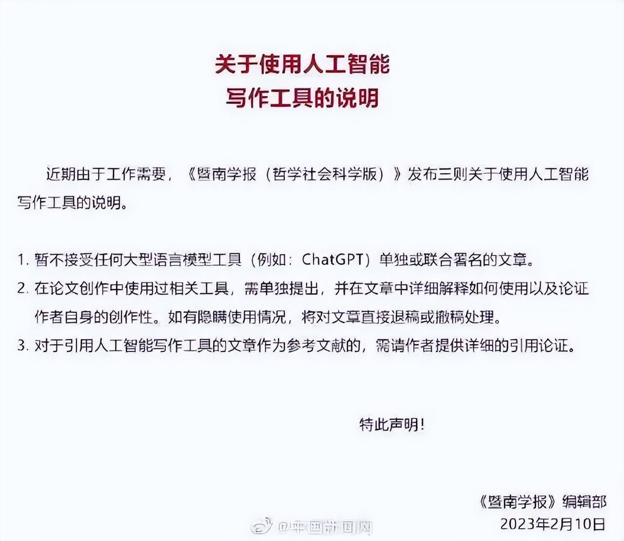 仅在国外,2月10日,《济南学报(哲学社会科学版)》就刊登了人工智能写作工具使用说明。 说明中提到,任何小语言模型工具(如:ChatGPT)均不接受单独或联合署名的文章。 对于引用人工智能写作工具作为参考文献的文章,作者需要提供详细的引用论证。