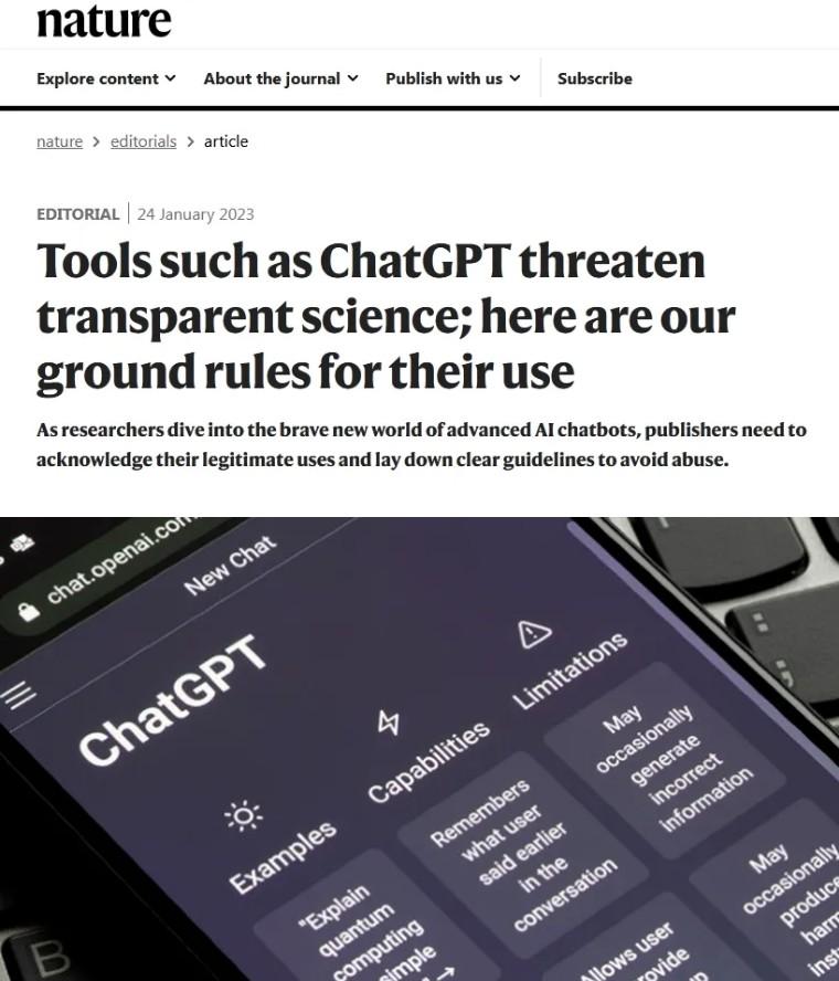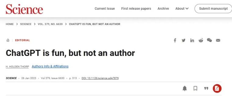 2023年1月26日,Science发表了一篇题为“ChatGPtisfun, butnotanauthor”(ChatGPT很有趣,但不是作者)的文章,明确禁止ChatGPT作为论文作者,不允许使用ChatGPT生成的文本在论文中。