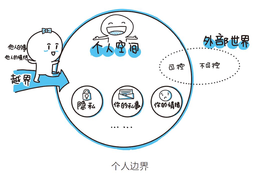 你可以在自己周围画一个圈,这个圈就是你在人际交往中的个人边界。 圆圈内是你的私人空间,别人能不能触及,由你来掌控。 圈外的部分不受你的控制,可以被其他人触及。