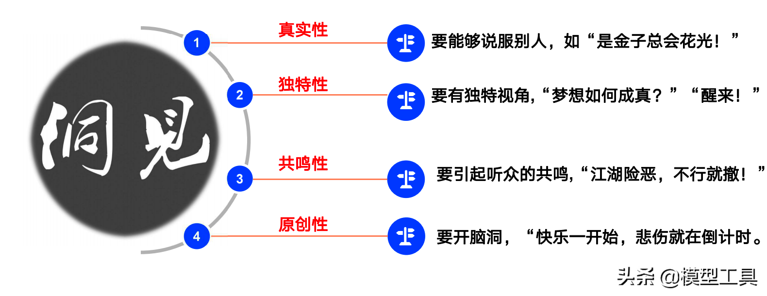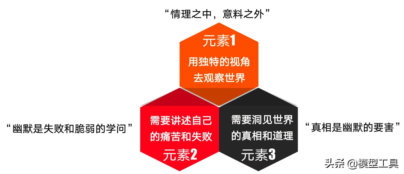 幽默需要洞察真相。 最常见的感悟是影视作品中的经典台词。 一个好的洞察力会让听者感到有趣和有意义。 见解通常具有以下特征:
