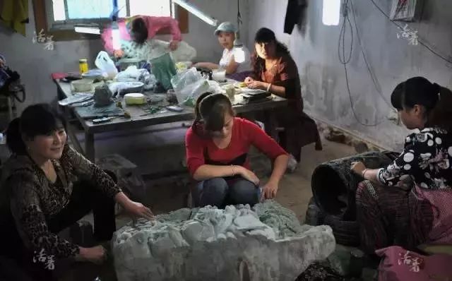 ▲抛光工序的技术集中度不是很高,很多女性也加入了这个行列。 狭长的空间里,有七八位木雕师傅在加工,加工与销售分离是扬州玉器的特色。