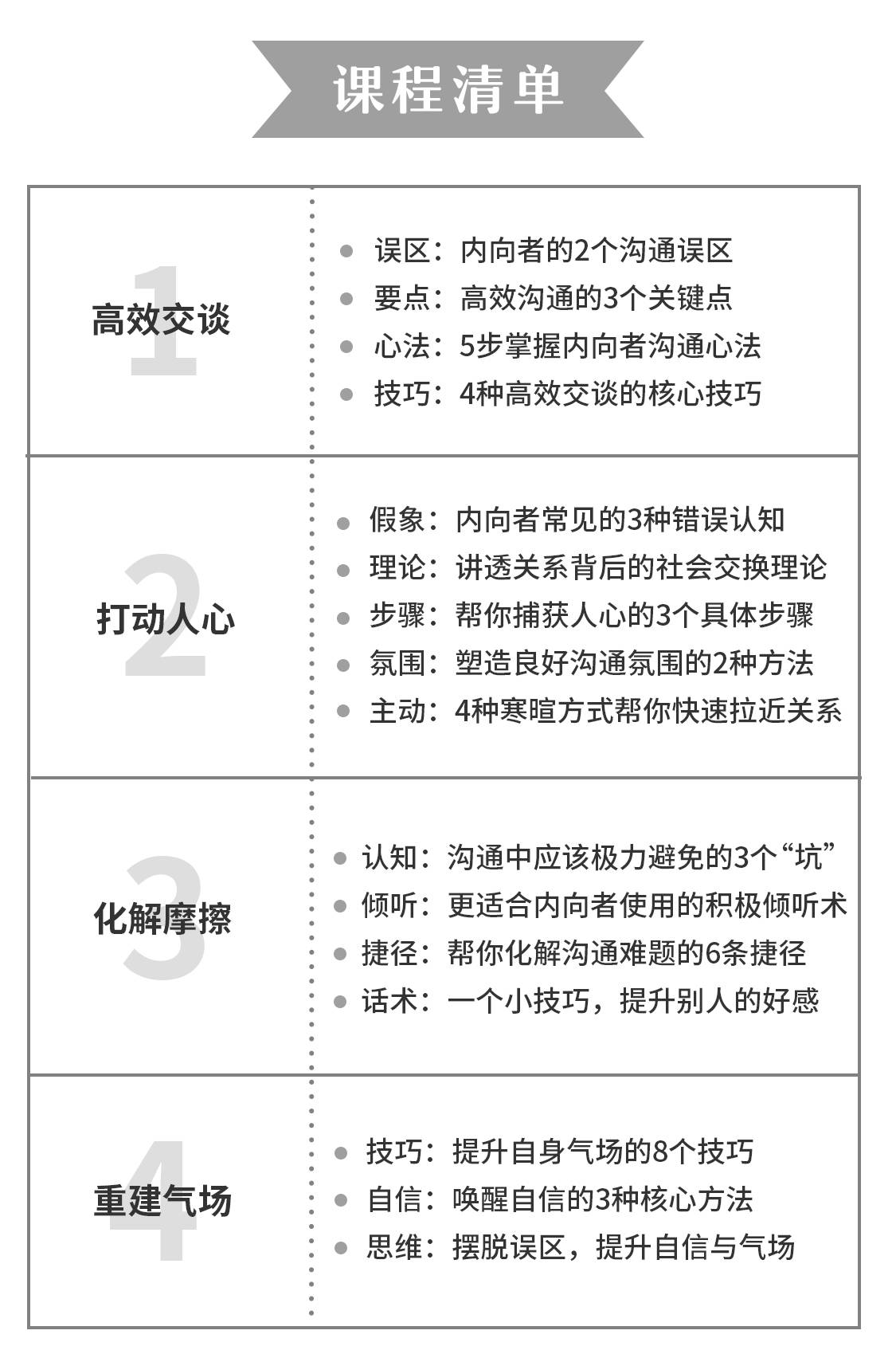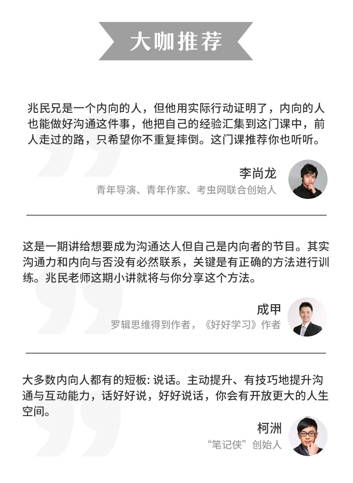 今天,奋达与兆敏多次交流合作,带来了《内向者高效说话的捷径》、《内向者俘获人心的捷径》、《内向者解决困难的捷径》、《内向者的捷径》、《内向者的捷径》等4门精英小讲课。而《外向者重塑气场的捷径》几乎囊括了大多数人都会遇到的各种沟通难题。