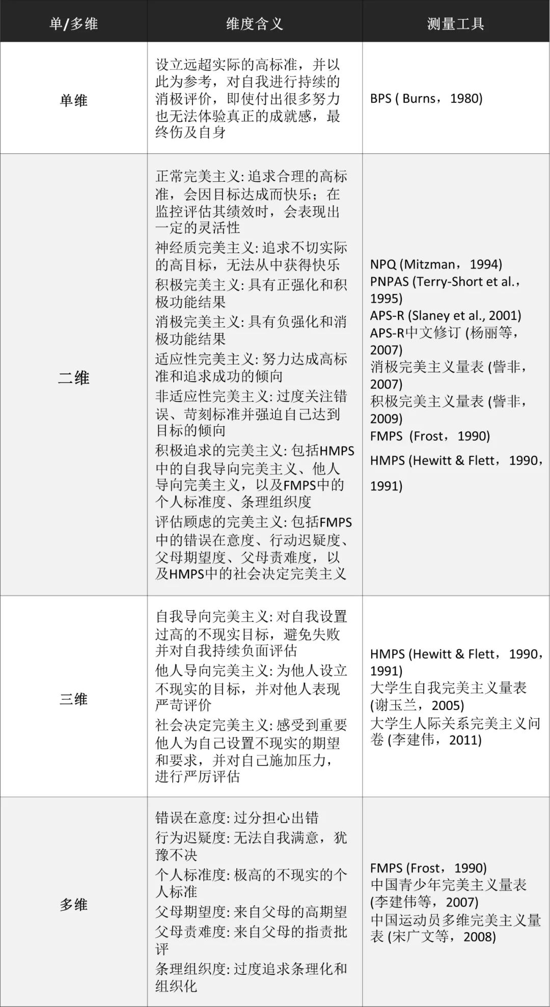 首先简单介绍一下完美主义结构的演化过程和使用的检测工具。 在大量实证研究的基础上,学者们不断精简提炼,使完美主义的内涵整体上经历了从单一维度结构向多维度结构的转变。