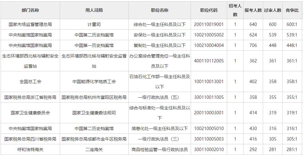 此外,去年共有12063人报考公务员考试,10585人缴费成功领取面试准考证。 报考后放弃缴费的比例明显低于之前,整体竞争比达到46.6:1,创历史记录。 竞争最为激烈的职位是中共定远市委办公厅职位,竞争比例为258:1。