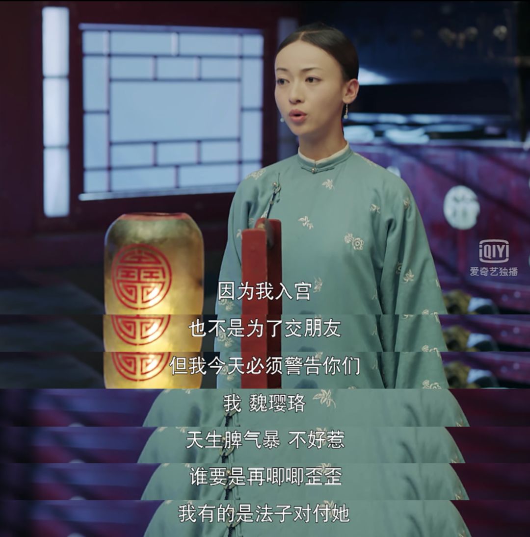而在《延禧攻略》中,璎珞一进宫就对取笑她的宫女说了狠话:“我天生脾气暴躁,惹不起。”