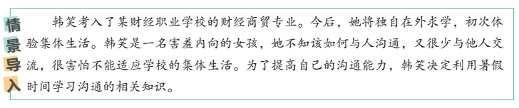 设置在每个话题的开头,以财经职业中学中学生韩晓为主角,总结他在学习、生活和工作中经常遇到的沟通问题,编成衍生情境,并引出话题。