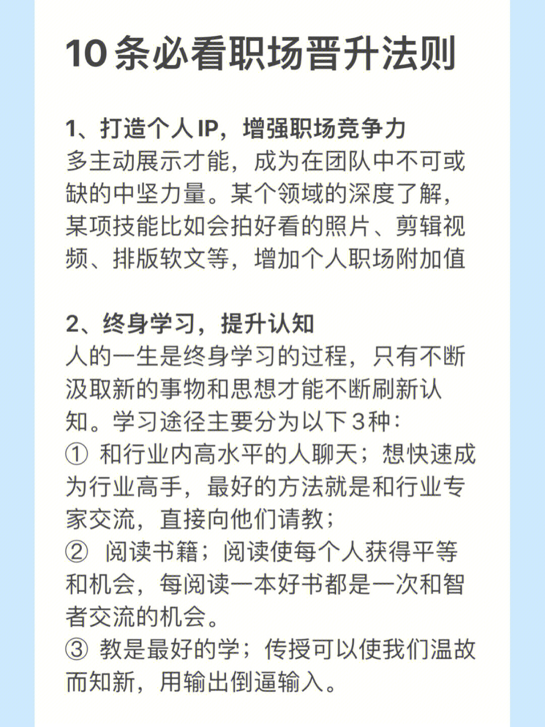 以上就是职场前辈最快晋升的秘诀,你学会了吗? 如果你想在职场上取得更大的成功职场升职技巧,那么你就必须学习和实践这个秘诀,让自己成为一个更好、更全面、更有影响力的专业人士。