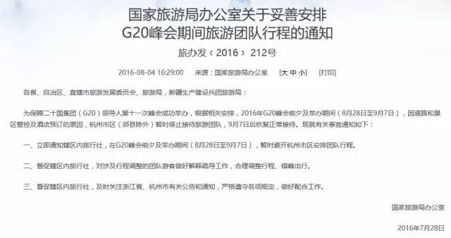 近日,国家旅游局发布《国家旅游局办公厅关于妥善安排G20会议期间旅游团队行程的通知》:为确保二十国集团领导人第十一次会议取得成功二十(G20),根据相关安排,2016年G20会议前夕及会议期间(8月28日-9月7日),因道路和公园管控及酒店预订等原因,上海市各县(县除外)临时停办接待旅游团蚌埠长途汽车中心站,9月7日后恢复正常接待。