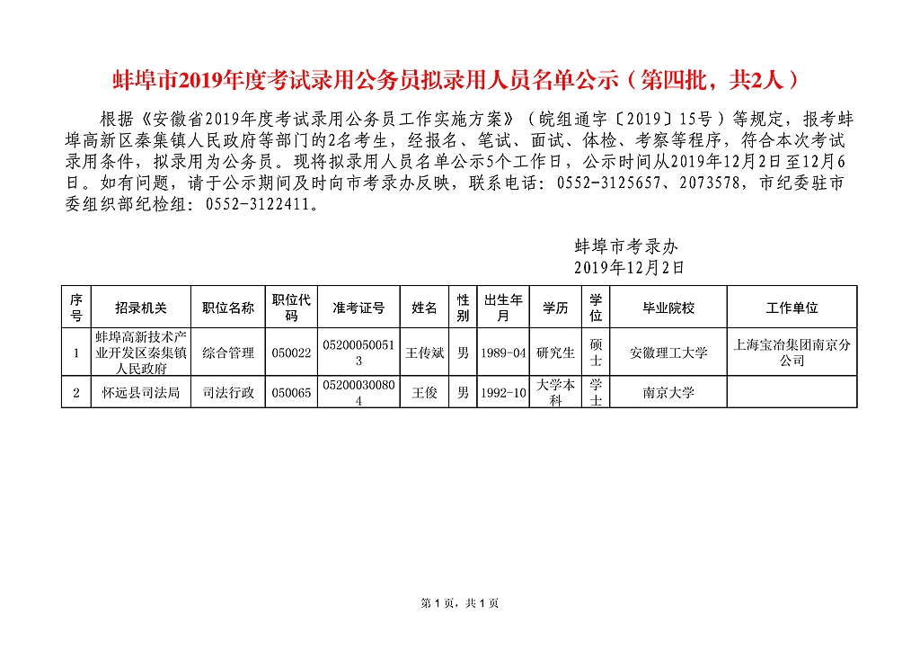 2023年蚌埠市考试录用公务员拟录用人员公示(第二批)