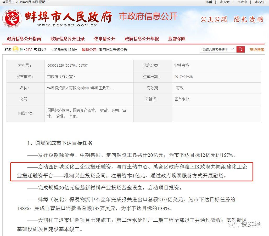 公司为扬州市投资集团有限公司,为东部城区化工企业搬迁启动融资。 与市土地储备中心、渝汇区政府、淮上区政府共同设立化工企业搬迁融资平台——淮河中信投资公司蚌埠车牌拍卖,注册资本1万元,通过政府认购服务融资。