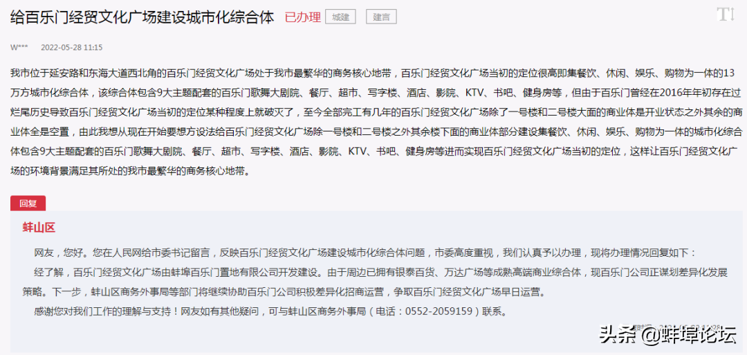 对此,蚌山区政府给出了答复:现在百乐门正在谋划差异化发展战略。 下一步,榜山区商务外事局等部门将继续协助百乐门积极开展差异化投资运作蚌埠万达广场商圈前景,力争百乐门。 经贸文化广场将尽快投入运营。