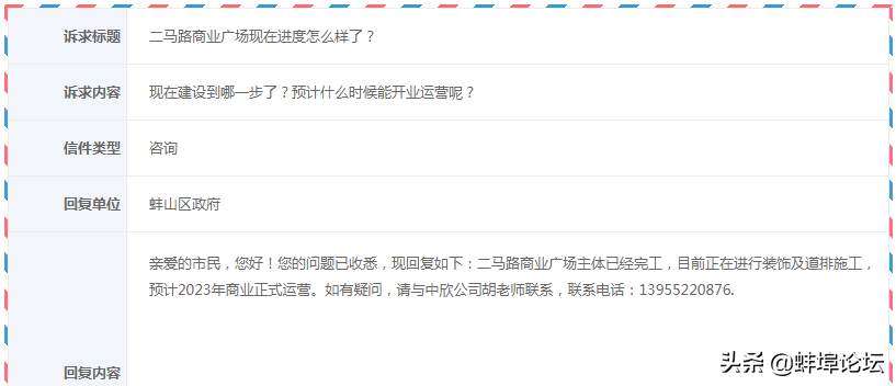 对于网友提问的二马路商业广场建设进度,官方回复称: