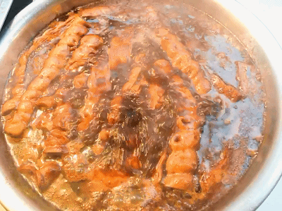 他家的熟食切好后,会在后面的锅里煮一会儿,然后根据个人口味加入甜豆瓣酱、香菜和茄子。