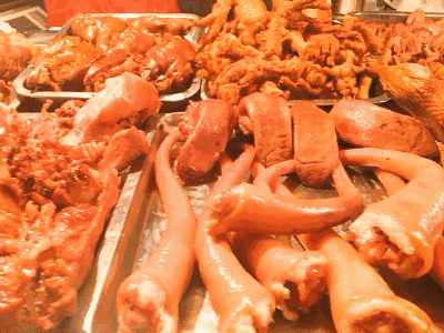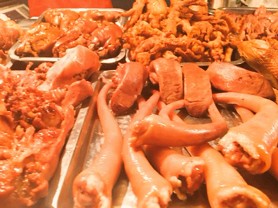 我问老板他的招牌菜是什么,老板任性地回答:“都好吃,就看你更喜欢哪一个了。” 哈哈,无奈小编看了一眼众人,菜品也是很常见的猪头肉、猪鼻子、鸭屁股、鸭脚之类的,装满了一卡车~