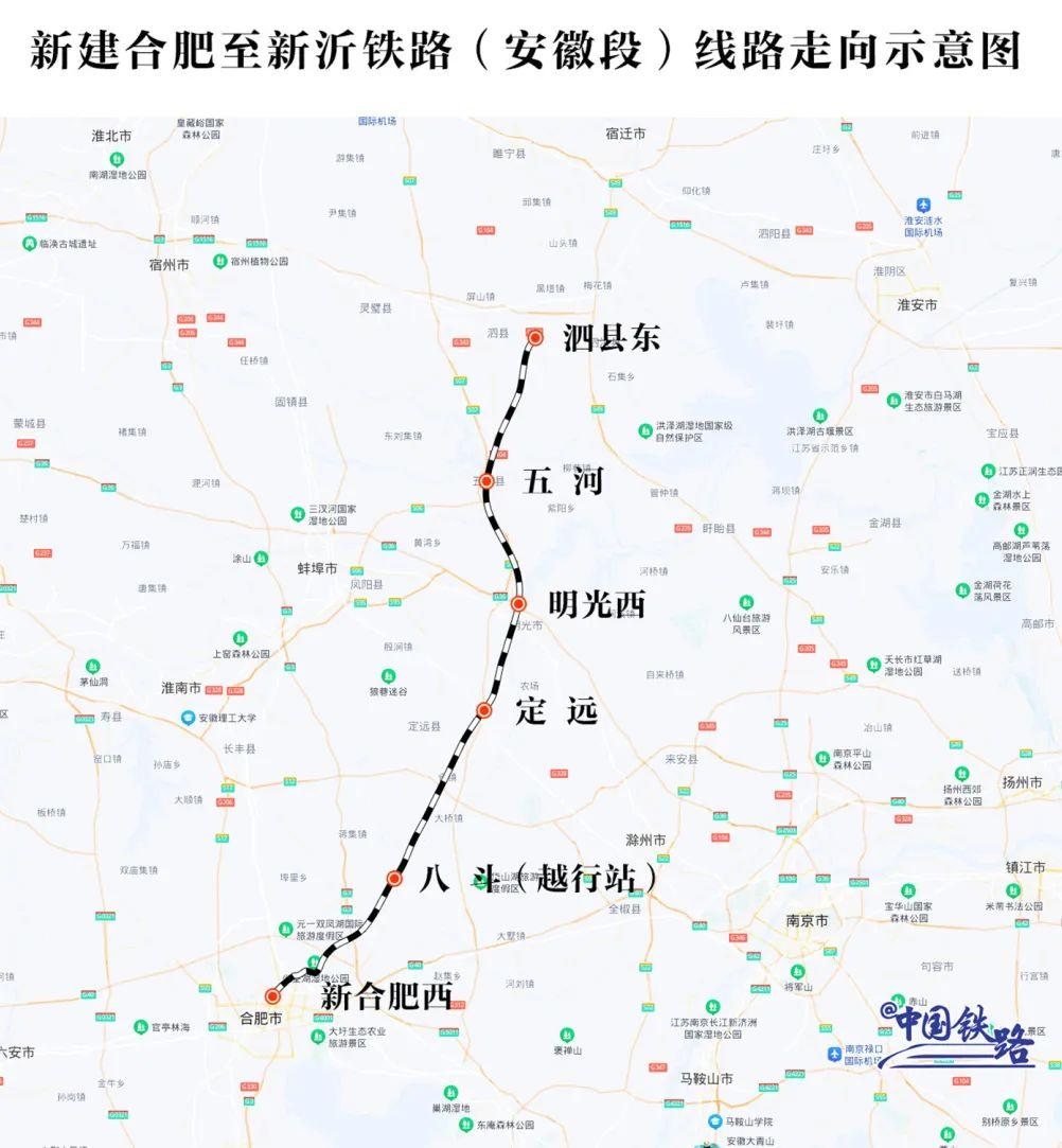河新铁路湖南段途经南昌、滁州、蚌埠、苏州等地。 全线设有新县东、五合、明光西、定远(搬迁改建)、八斗(月兴站)等北站,设计时速350公里,线路全长207.4公里。