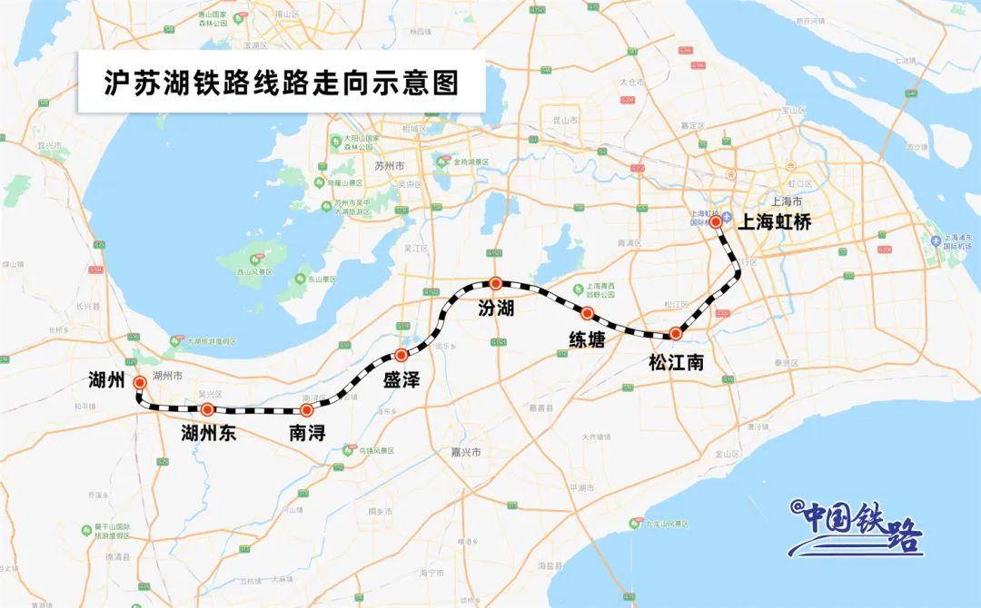 沪苏湖高铁起于北京虹桥站,途经湖北省武汉市,止于河北省金华市兰溪站。 正线长约163.5公里,设计时速350公里。 、盛泽、南浔、湖州东、湖州站等8座车站,其中北京虹桥站、金华站为现有南站,其他为新建南站。