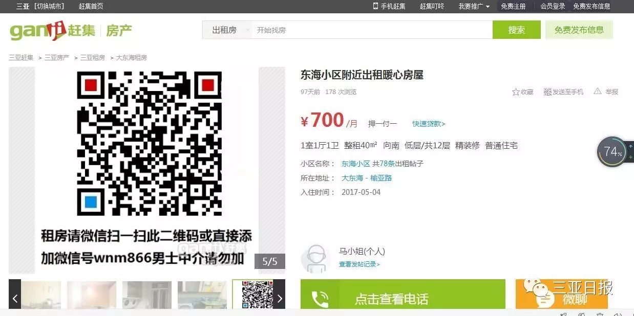 “马小妹”在赶集网发布了租房信息。 (网页截图)