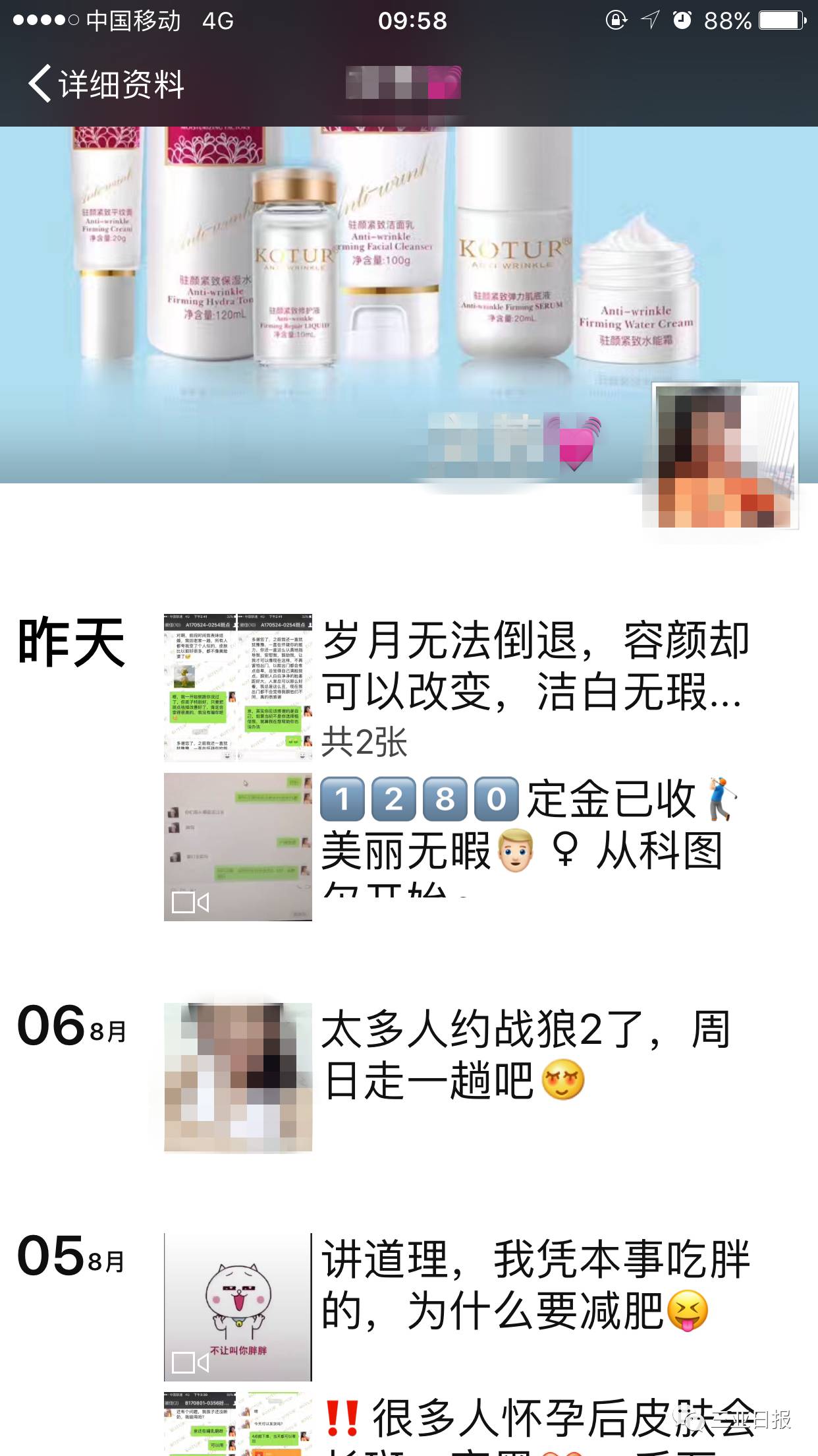 “和没有人加好友相比,人多肯定更好,生意就是这样做的,顾客多了才叫生意。” 来自福建的穆尼是某产品在某地区的总代理。 因为莫莫,她走上了微商之路,除了产品销量红火之外,实体店也开了。 他的同学圈每天晚上都会发布十多个产品广告,有时三天就能发布几十个广告,堪称“刷屏”。