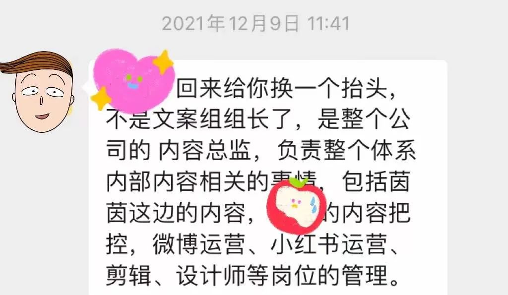 我愣了一下,才反应过来,这是什么? ? 有升职吗? ? ?我看了好几遍才敢确认。 我心里既兴奋又着急! 算起来,这已经是我在公司第二次升职了。 我第一次升职是在2019年2月,也就是我在公司已经三年了,接到银银的通知,要兼任文案组总监,负责整个小团队的管理。